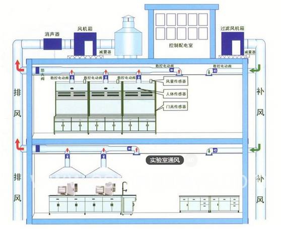 實驗室通風系統一般由通風設備、通風管道、消聲器、風機、控制系統組成。
